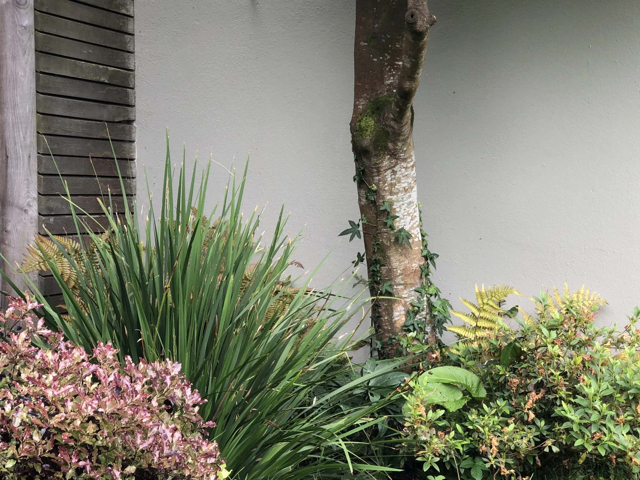 La transition entre la cour gravillonné et la coursive sud de la maison se fait à travers une végétation légère et mouvante. Quelques marches et des masses arbustives isolent le jardin des voitures stationnées en contrebas.